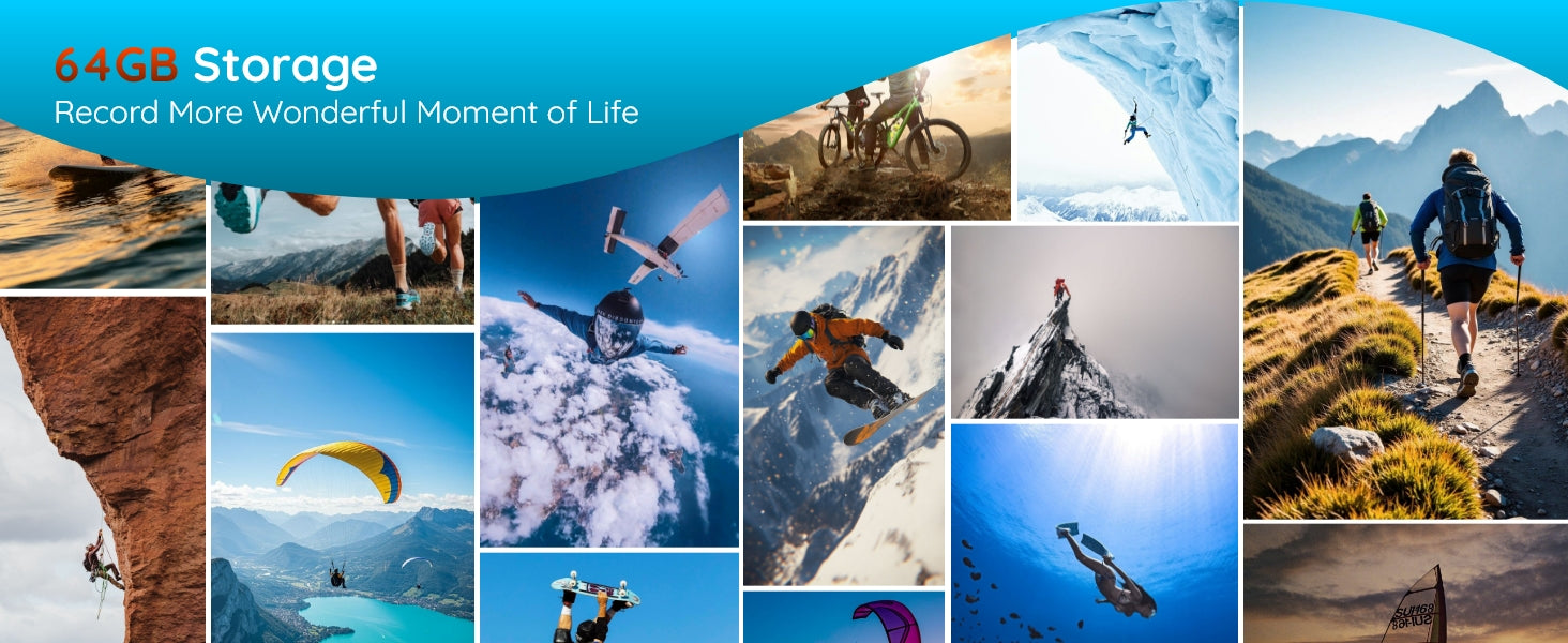 【64GB Built-in Memory】Enjoy worry-free recording with 64GB of built-in storage. This waterproof camera also supports expandable memory cards up to 128GB, so you can store more photos and videos without hassle.