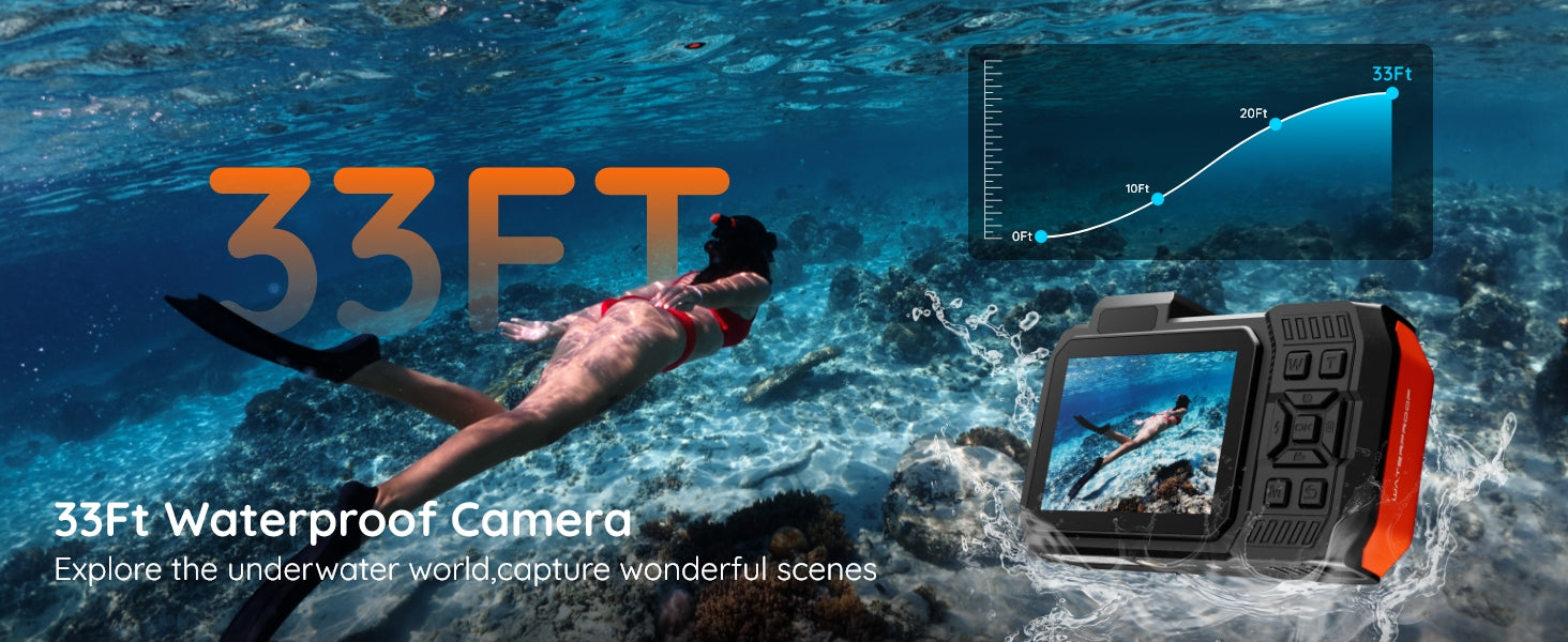 【33FT Waterproof & Floating Design】This underwater camera is waterproof up to 33FT(10M) and features a floating design, making it perfect for snorkeling, diving, and water sports. It won't sink if dropped in water, ensuring your device stays safe and retrievable.